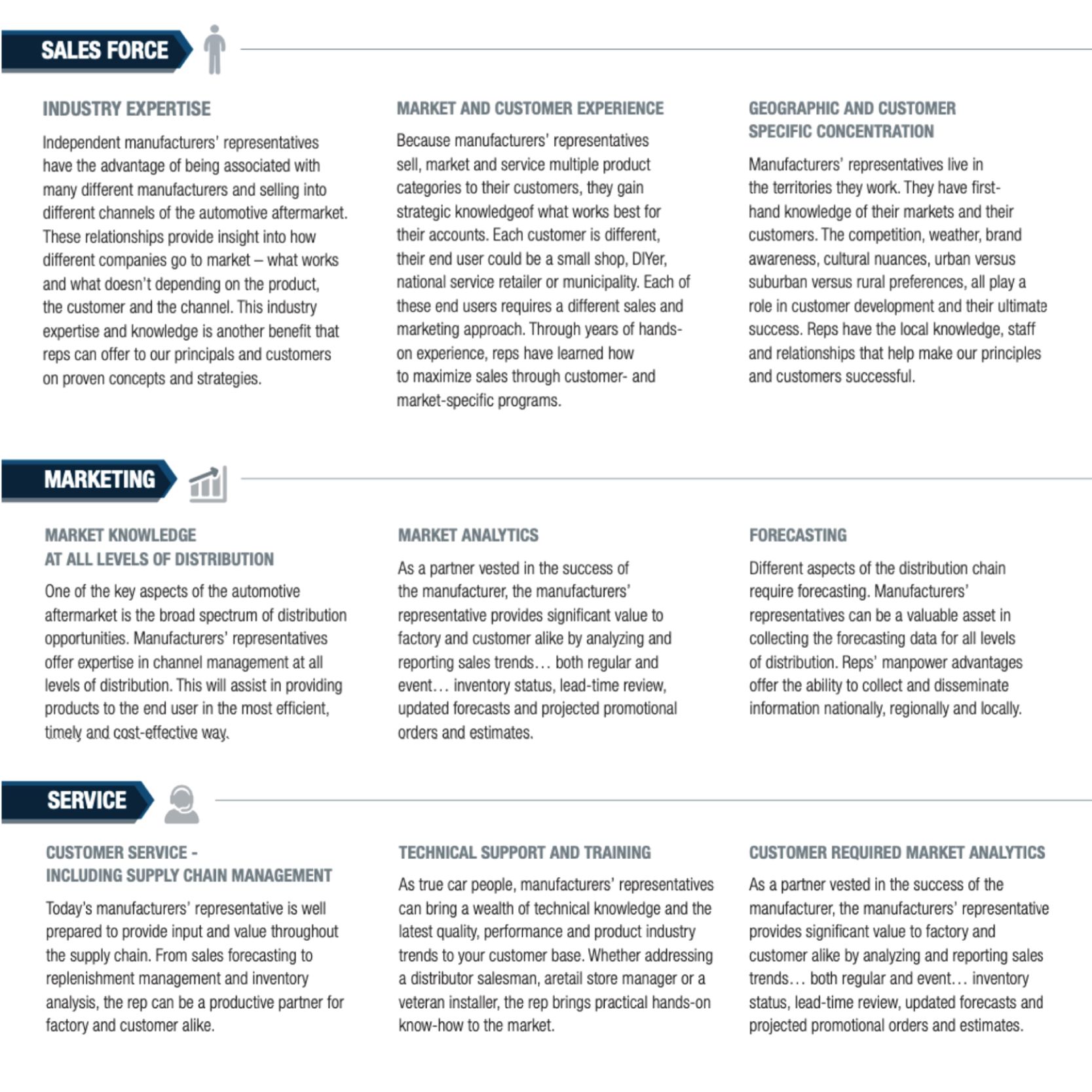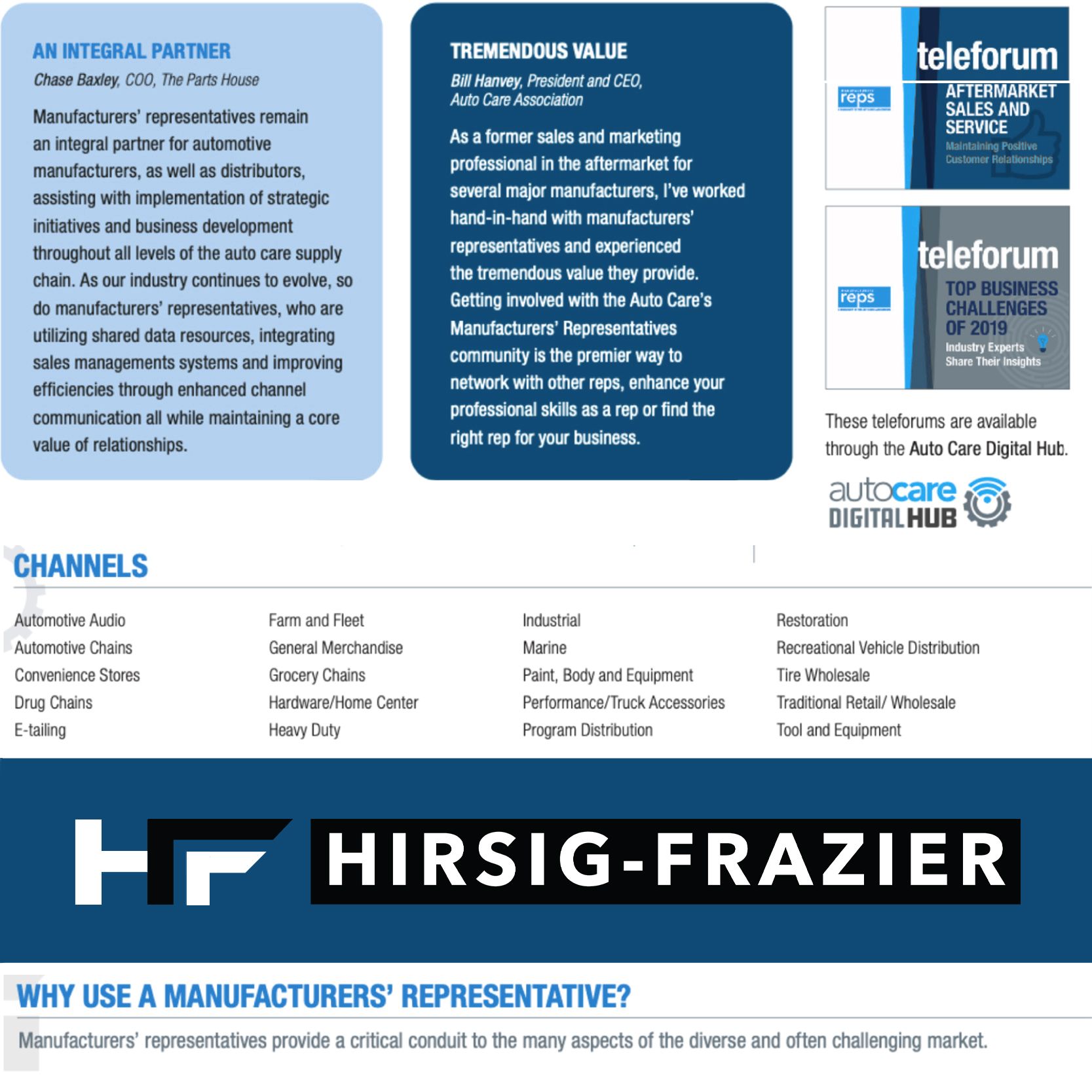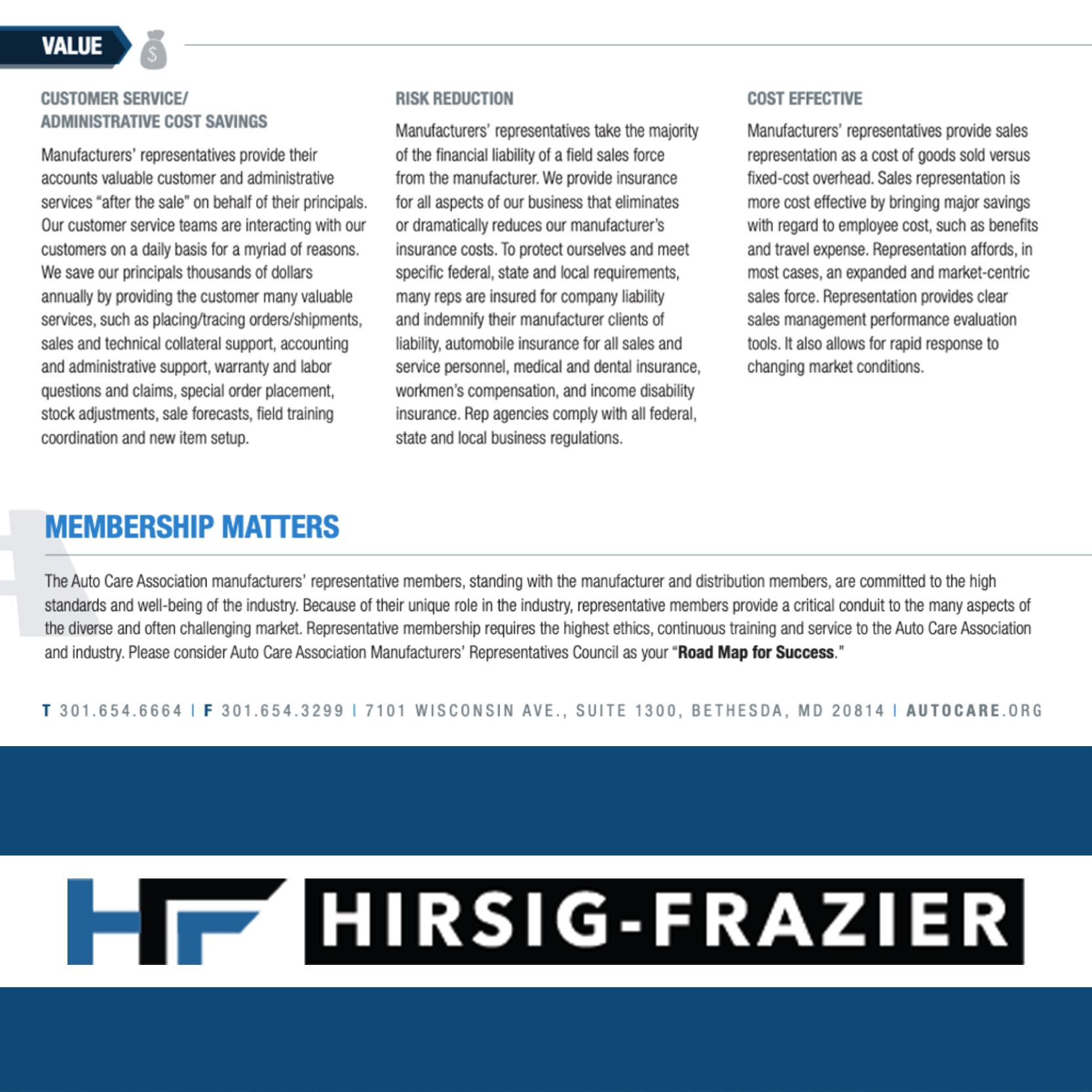 Manufacturers’ representatives like Hirsig-Frazier provide the link between brands and the aftermarket channels that drive growth. With decades of experience, we combine market knowledge, technical training, and customer insight to help our partners compete and win.